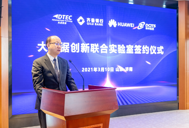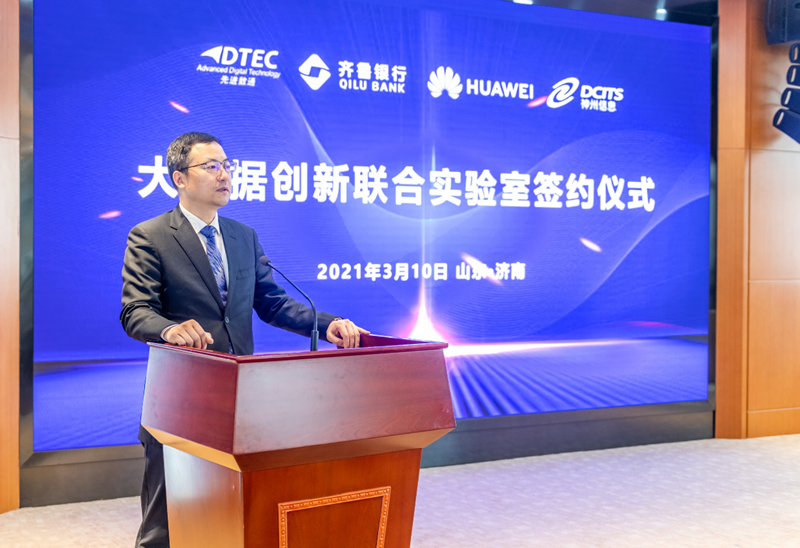 平安陆金所副总裁金麟先生在致辞中提到,平安陆金所自2000创建以来不断专注于中国金融信息化的建设,软件解决方案的90%以上的业务集中于金融行业,紧跟中国银行业数字化转型的浪潮,公司现在在金融分布式架构、金融数据中台、金融大数据应用、区块链应用解决方案均处于行业先进地位。希望与齐鲁银行、华为公司、神州信息一道让大数据创新联合实验室为齐鲁银行业务开展创造价值,成为中国商业银行数字化转型的标杆!